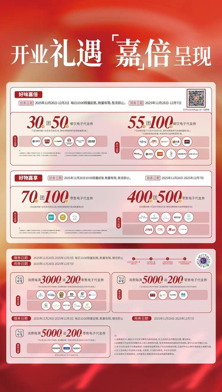 围绕店庆与开业主题,天津嘉里汇推出多层次促销活动,激活消费潜力。大众点评30团50、55团100餐饮电子代金券,70团100、400团500零售电子代金券覆盖全品类消费热情;满3000返200、满5000返200电子代金券等满额返券活动强化一站式购物体验,进一步提高消费热情。多重开业优惠通过增强消费者获得感,助力开业期消费热度攀升。
